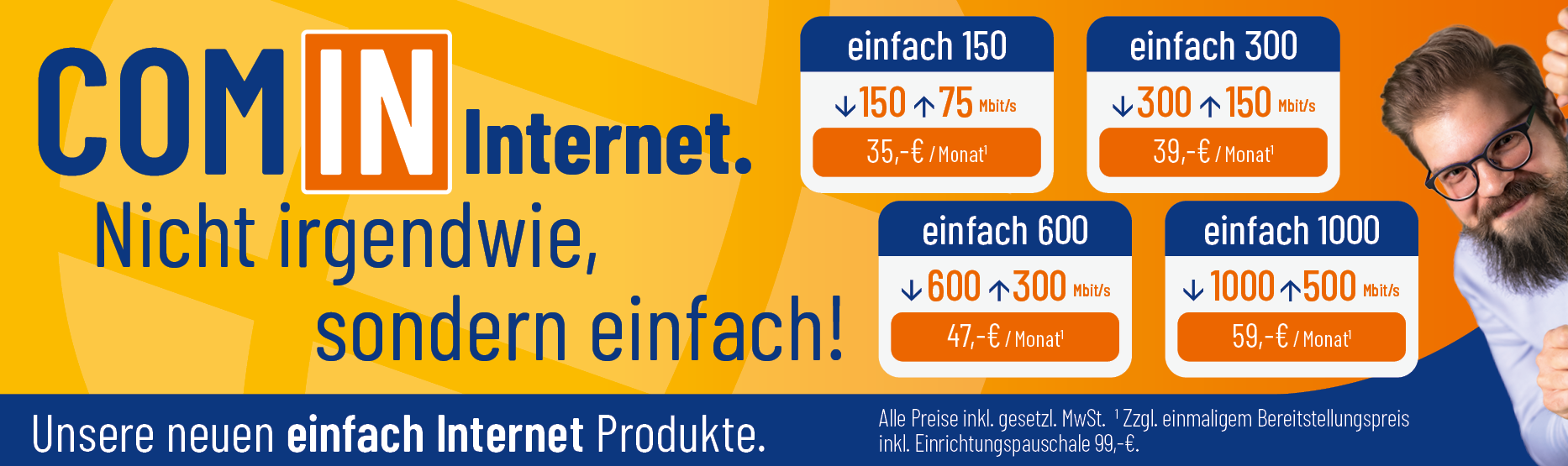 Unsere einfach Internet Produkte bieten Ihnen vier flexibel wählbare Bandbreiten – 150, 300, 600 oder 1.000 Mbit/s – und damit genau die Leistung, die zu Ihrem digitalen Alltag passt. Dank der stabilen FTTH Glasfasertechnik von COM-IN profitieren Sie von einer nachhaltigen, störungsfreien und jederzeit zuverlässigen Verbindung, denn bei FTTH geht die Glasfaser direkt bis in Ihr Haus oder Ihre Wohnung. Ob Homeoffice, Streaming oder Gaming: Mit Glasfaser aus regionaler Hand genießen Sie höchste Qualität zu fairen Preisen ab 35 Euro pro Monat.
